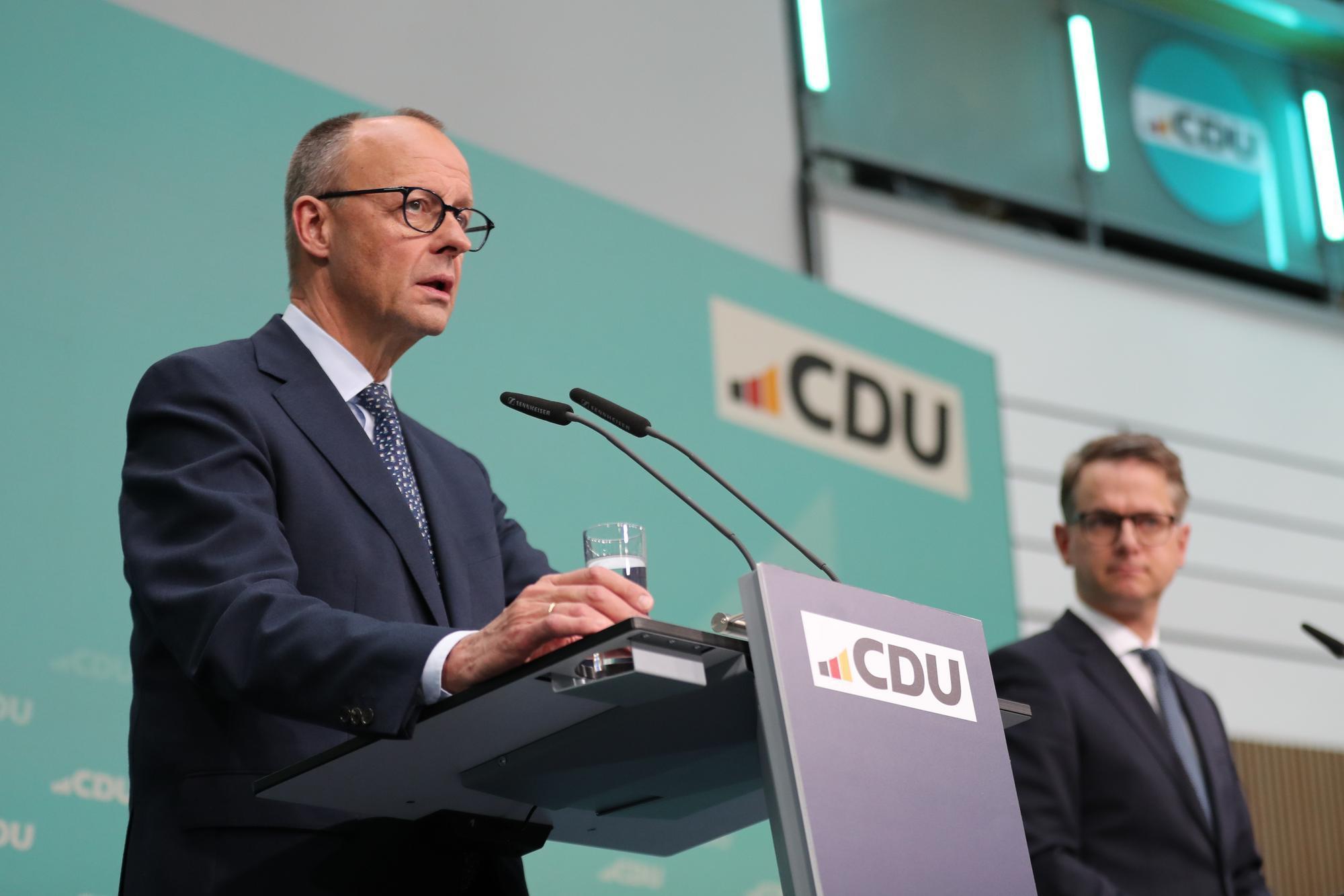 2月24日,在德国柏林基民盟总部,德国联盟党总理候选人默茨(左)出席新闻发布会。新华社记者杜哲宇摄默茨24日在一场记者会上披露,他已与内塔尼亚胡通话,并告诉对方,“新一届政府组建后,我们应该尽快会面”。